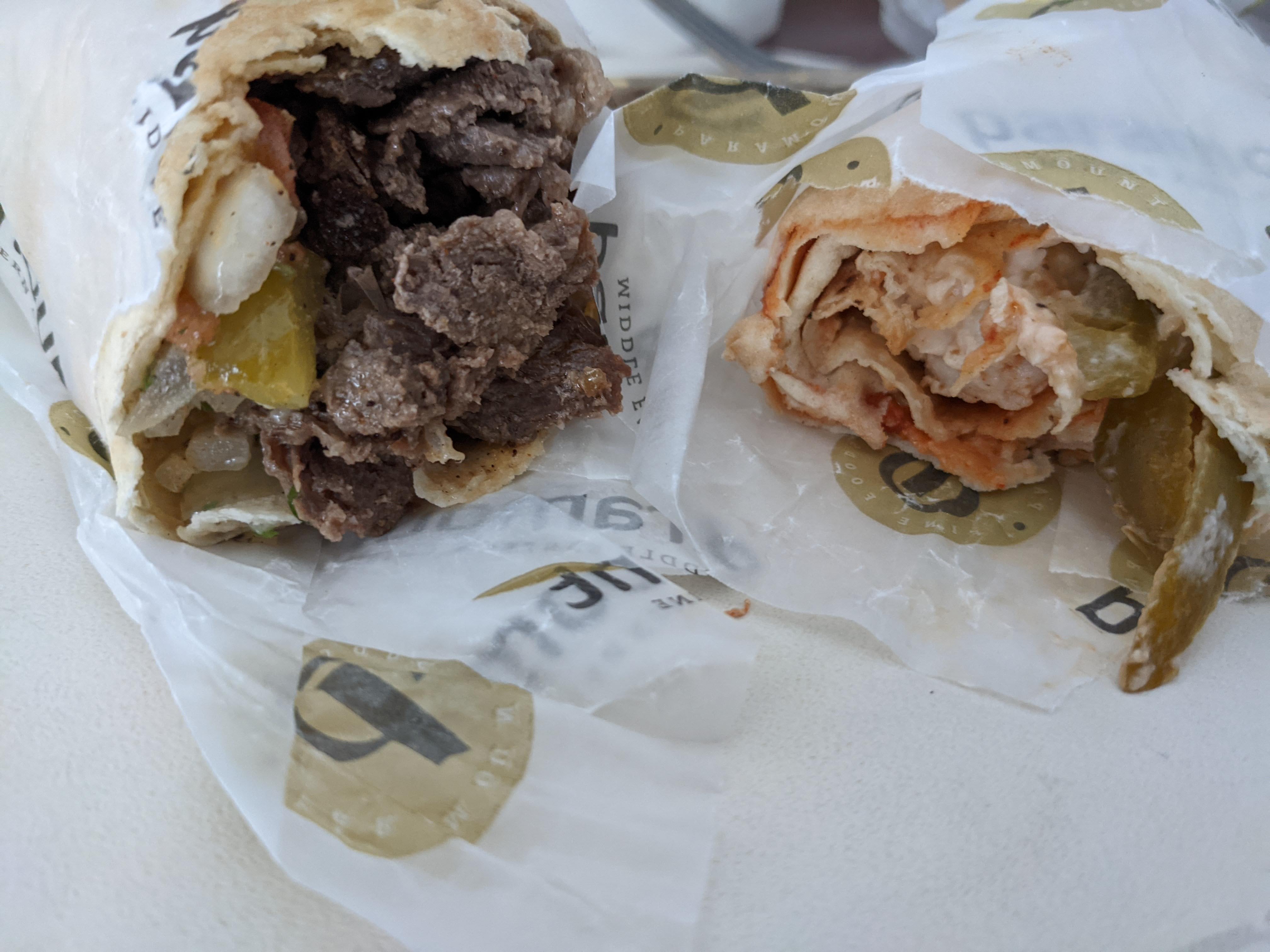 The chicken shawarma had really dry chicken today and just barely enough garlic sauce and pickles.