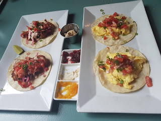 Jalisco Chocolate chip pancakes with mango butter and Huevo Rancheros (sunnyside eggs and cheese, tortilla and beans)