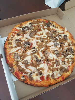 Bottom: roast garlic, chorizo, bacon, red onion, banana peppers, mushroom, spicy soppressata, chicken, pepperoni, sausage